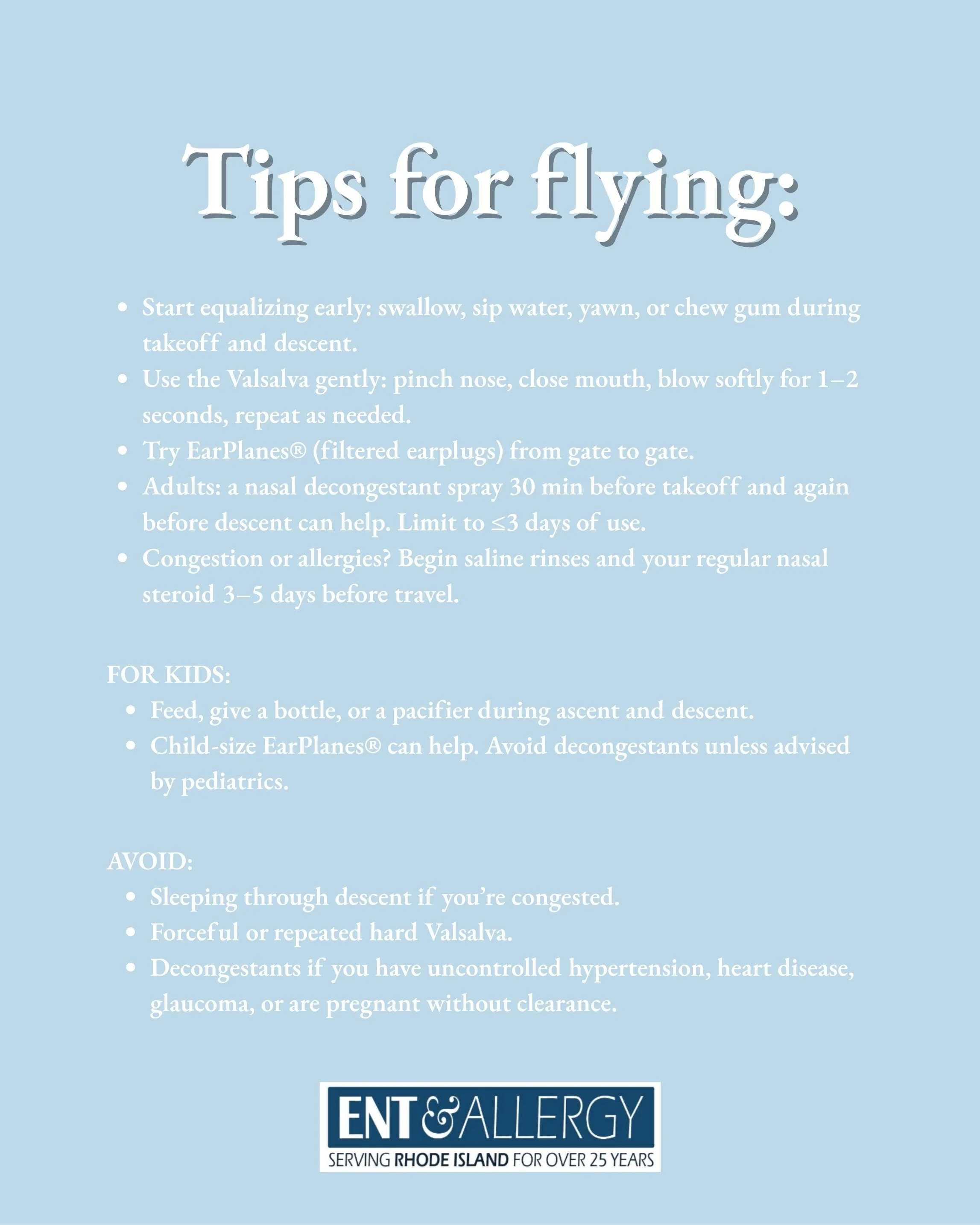Nasal prep if congested: isotonic saline rinses; consider a short-term topical nasal decongestant spray 30 minutes before takeoff and before descent. Limit sprays to ≤3 consecutive days.